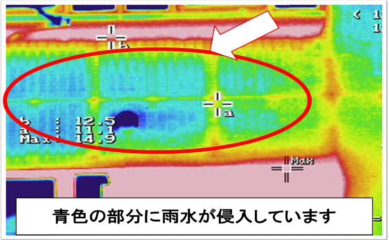 ・この建築物の外壁(タイル部)は周囲より温度が低く見えます(水色)、雨水の侵入していると思われます。(レインボーカラー)